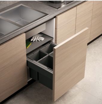 Hiding rubbish and recycling bins is key to a clean look. A built-in bin inside base cabinetry, or a slide-out system, keeps your bins out of sight but quick to access. You push a cabinet front and the bins slide out. You can have one or two or fout compartmant options, for recycling, organic waste, packaging etc. This smart kitchen storage solution will keep your kitchen clean, fresh and uncluttered.